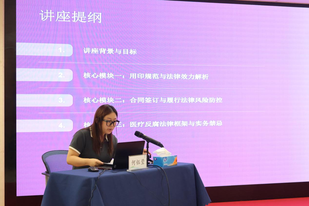 本次培训紧密围绕公司主责主业,聚焦用印规范、合同签订、医疗反腐等方面,以“靶向破题”的思路为企业合规稳健发展保驾护航。在“用印规范”环节,律师们结合医药行业特性明确公章、财务章使用要点,通过用印失范致资产损失的案例提升员工风险防范意识;“合同签订”环节,律师们针对药品采购、器械合作等业务合同的风险点,结合实务提出可落地防控方案以守住供应链合规底线;“医疗反腐”环节,律师们通过最新监管政策解读行业廉洁红线与底线,引导员工树立合规意识,助力构建“全员参与、全程覆盖”的合规经营生态。