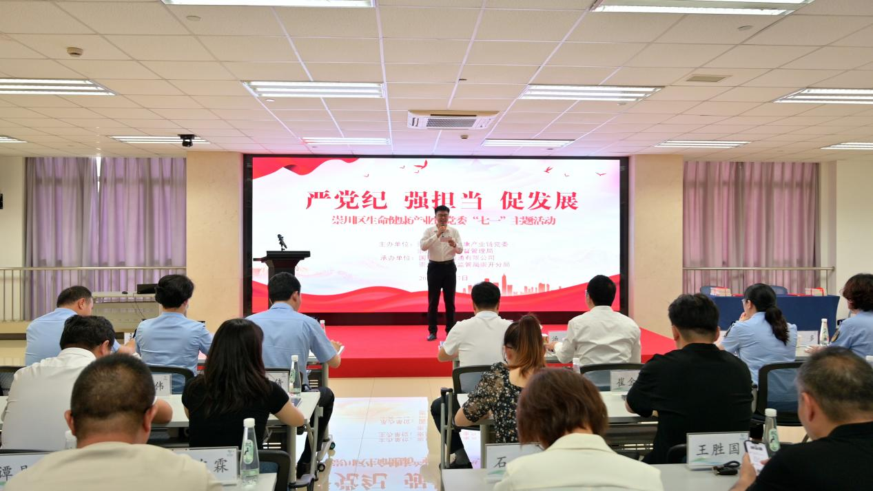 为庆祝中国共产党成立103周年,进一步加强党建引领作用,以“党建链”引领“产业链”,6月27日下午,崇川区生命健康产业链党委在国药控股南通有限公司6楼会议室举办“严党纪 强担当 促发展”七一主题活动。崇川区市场监督管理局、国药控股南通有限公司、崇川区市场监管局崇开分局党支部、产业链发展促进会党支部、宝月湖生命健康产业联合党支部的党员代表及区生命健康产业链上下游企业代表共聚一堂,探索高质量党建引领产业链高质量发展新路径,为推动产业繁荣贡献智慧和力量。